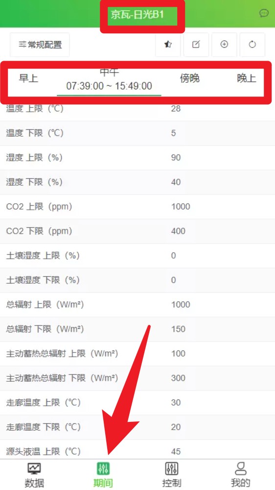 2. 点击底部导航栏“期间”,查看并设定各时间段的温度湿度等环境上下限参数。