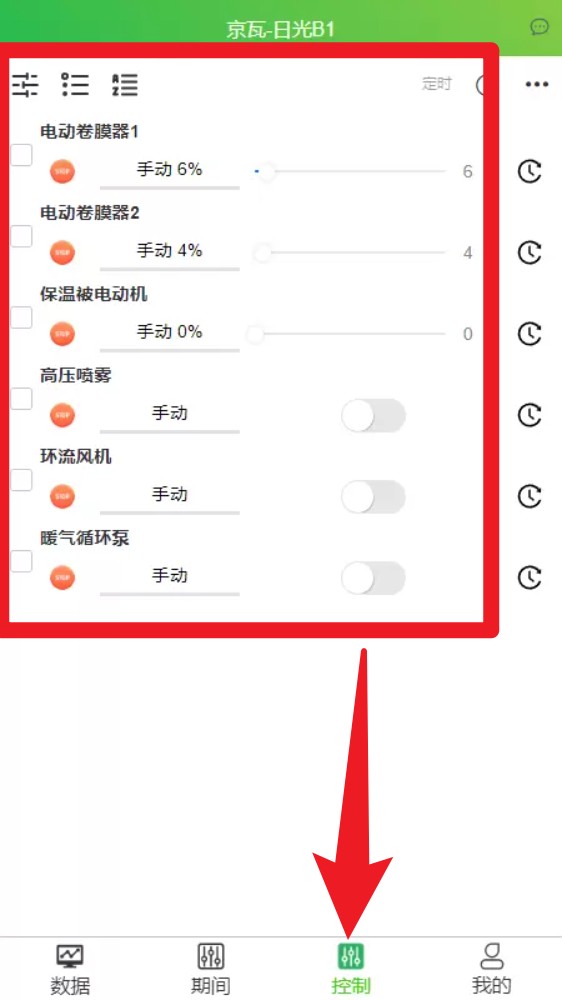 3. 进入“控制”页面后可远程手动调节设备状态,如卷膜器、喷雾机、风机等。