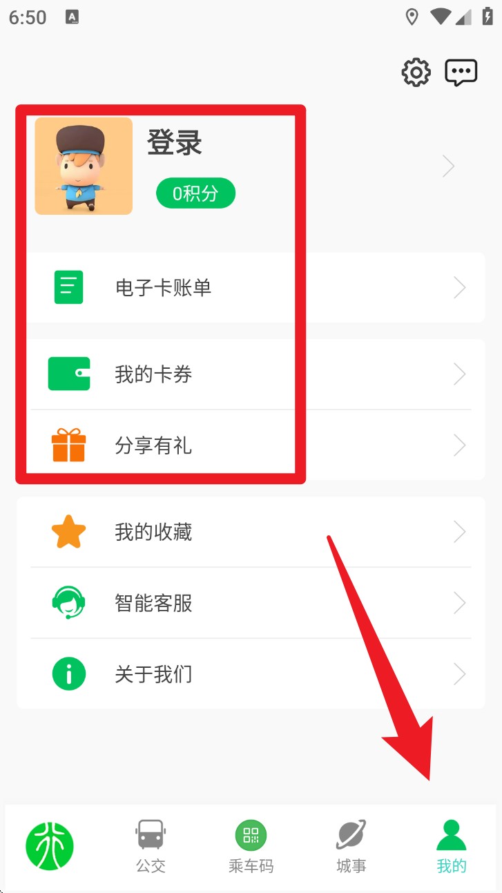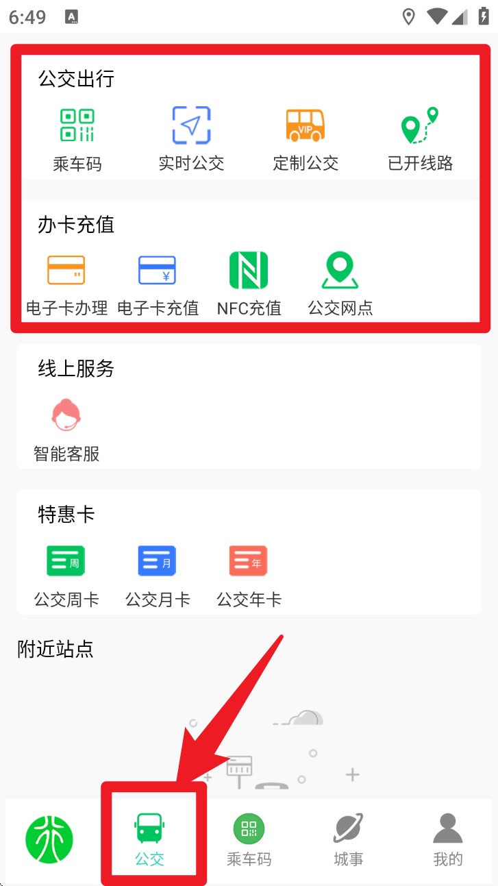 2. 切换到底部“公交”页签,可查看已开通路线、定制公交、办卡充值及电子卡处理等功能板块。
