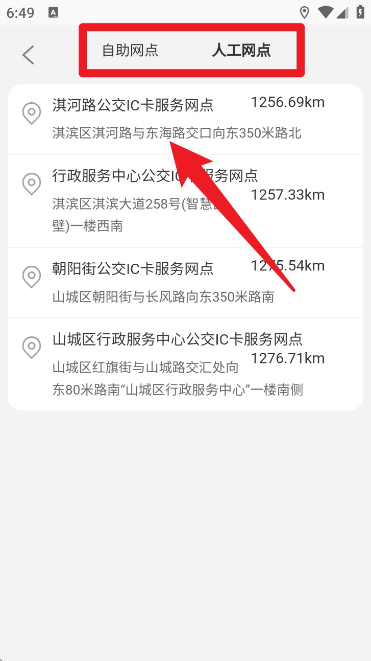 3. 点击“公交网点”可切换查看“自助网点”与“人工网点”,支持查看地址、距离与所在区域。