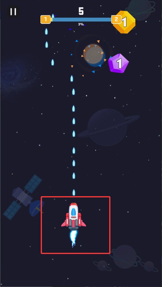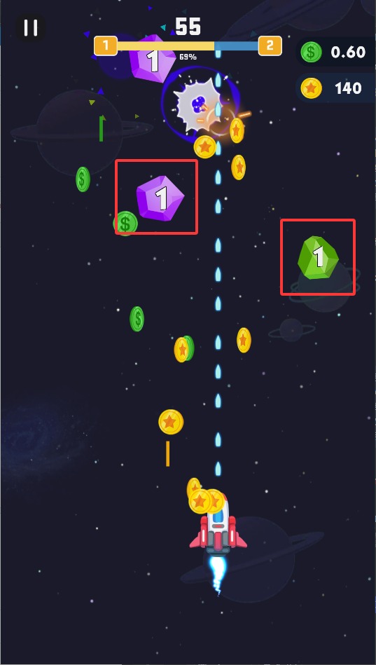 1、通过手指左右滑动屏幕控制飞行器移动,灵活躲避沿途障碍物,同时收集散落的宝石提升移动速度。