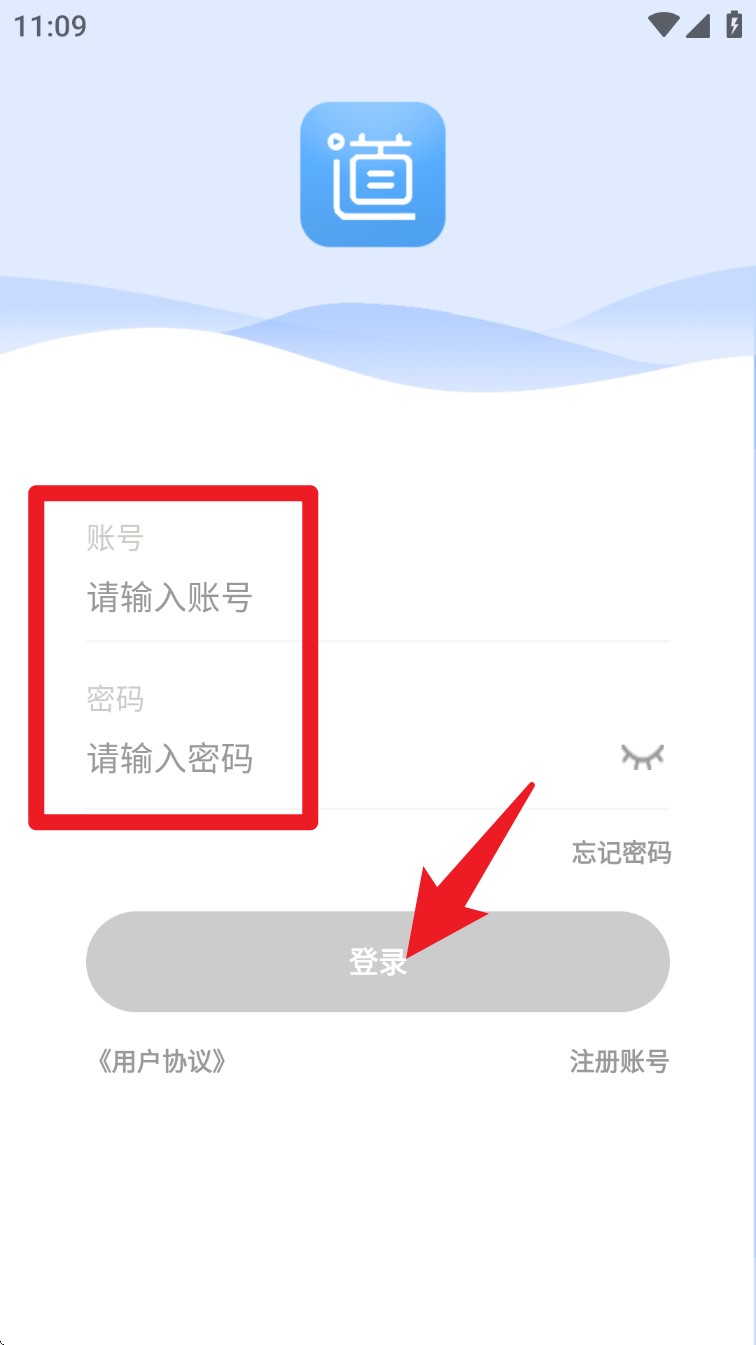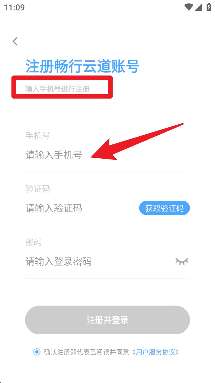 1. 打开畅行云道 App,点击“注册畅行云道账号”,输入手机号、验证码与密码后提交注册。