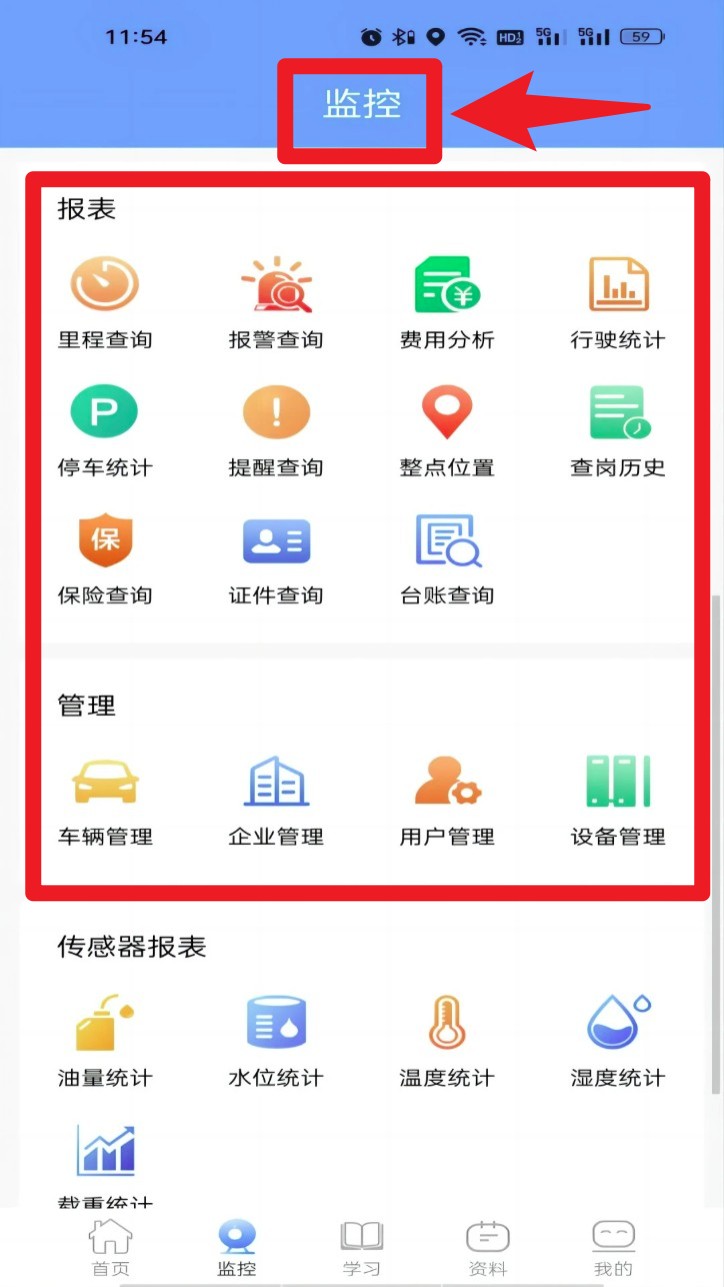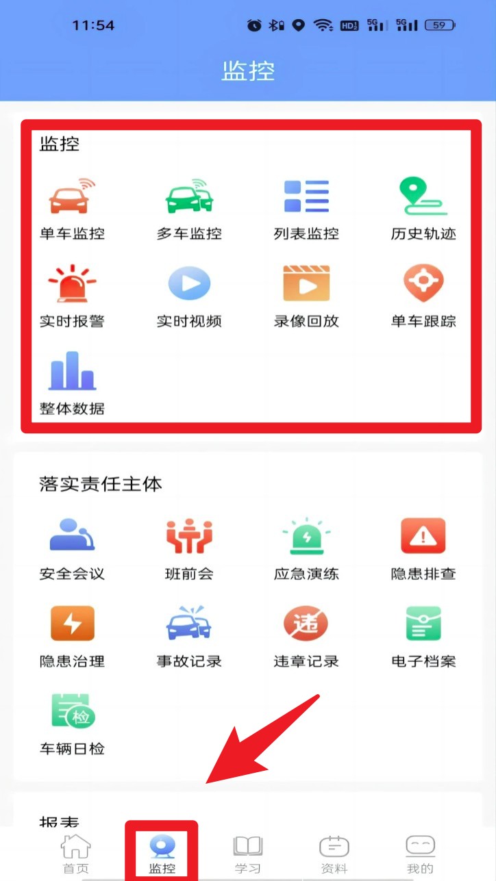 3. 登录后点击底部“监控”按钮,进入车辆监控板块,可查看实时视频、轨迹回放等信息。