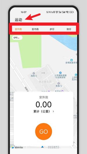 2、登录后点击“运动”选项,选择室外跑、步行等项目,并开启GPS定位开始记录。