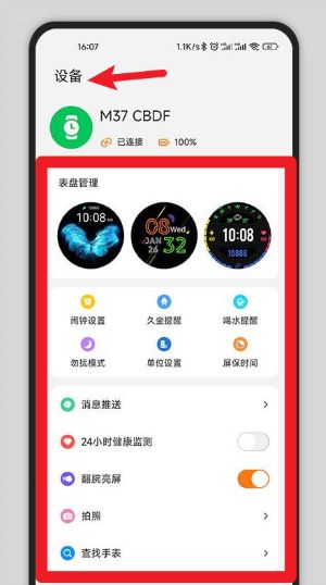 3、点击底部“设备”选项卡后,即可查看连接的手环信息并进入表盘与提醒设置页面。