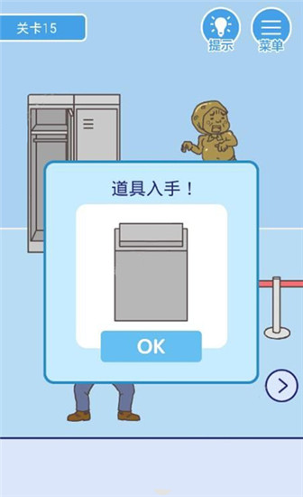 然后返回来到场景1,用油漆把主角全身涂抹后,就可以点击上面的站台,成功伪装成铜像,就可以躲避老板娘的追击,过关!