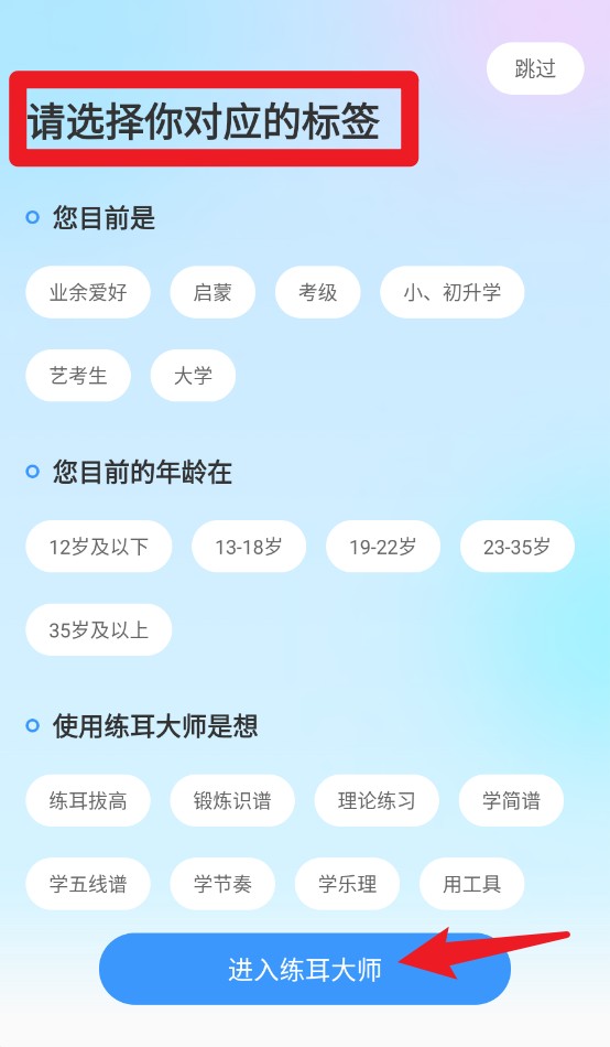 1、首次使用需选择身份、年龄及学习目的标签,系统将推荐个性化练耳学习方案。