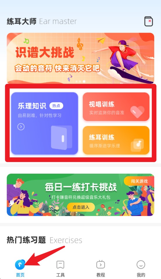 2、首页提供乐理知识、视唱训练与练耳训练三大模块,帮助用户系统掌握音乐基础。