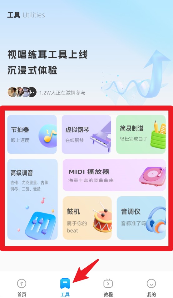 3、“工具”页面内含节拍器、虚拟钢琴、音调仪等实用工具,支持在线辅助练习。