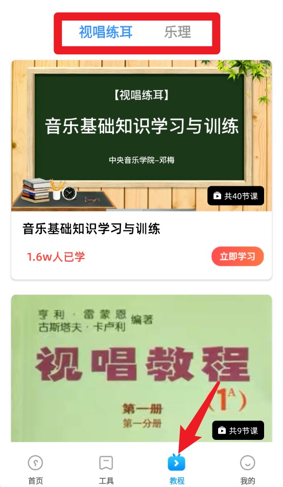 4、“教程”板块按视唱练耳与乐理分类,提供系统课程内容,适合跟随节奏逐步学习。