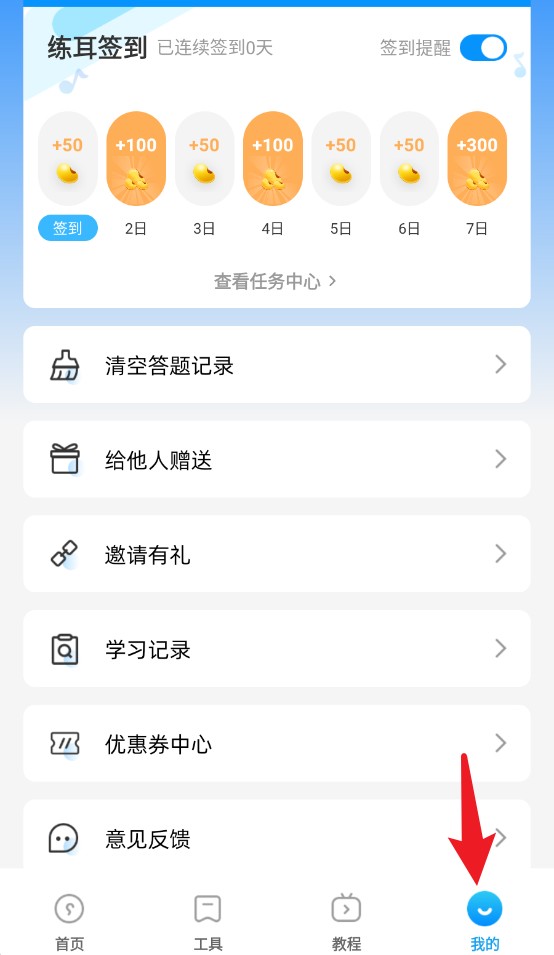 5、“我的”页面支持签到领金币、查看学习记录与兑换优惠券,激励用户持续学习。