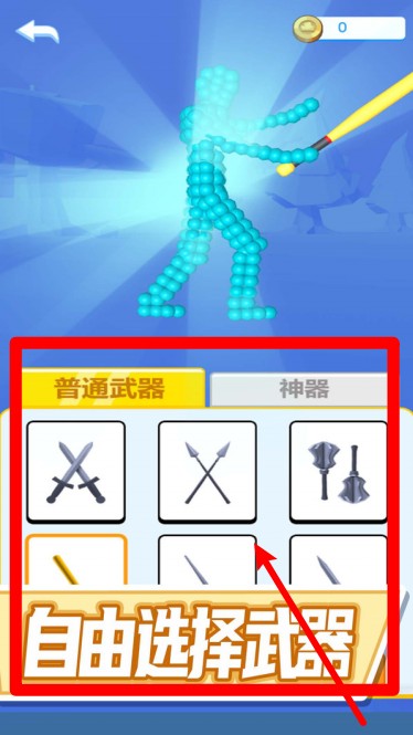 1.选择武器类型:点击下方“普通武器”或“神器”选项,自由挑选想要使用的战斗武器,每种都有不同攻击方式与手感。