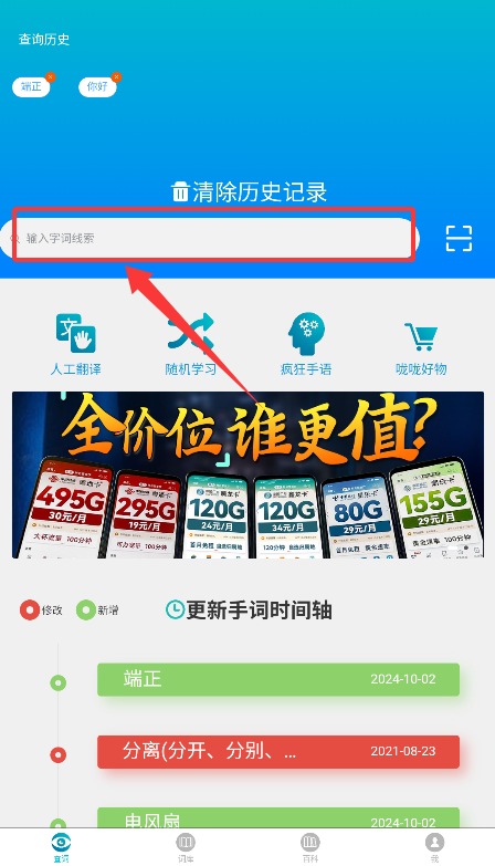 2、在首页顶部搜索栏输入需要查询的字词,点击搜索按钮获取相关手语信息。