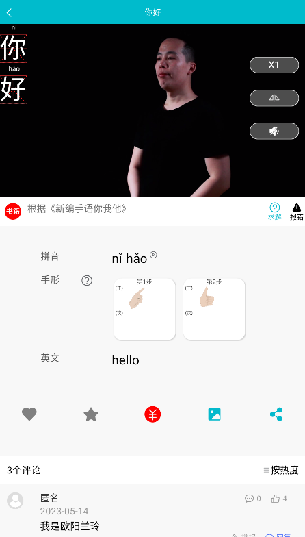 3、查询结果页面会显示详细的手势视频教学,同时提供拼音标注和手型分解图示。