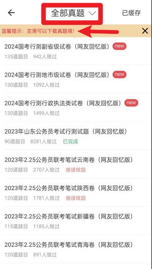 3、点击“历年真题”进入后,可通过顶部全部真题筛选考试年份及科类,再左右滑动试卷条目即可下载所需试卷,并在线练习各地历年公务员考试回忆版真题。