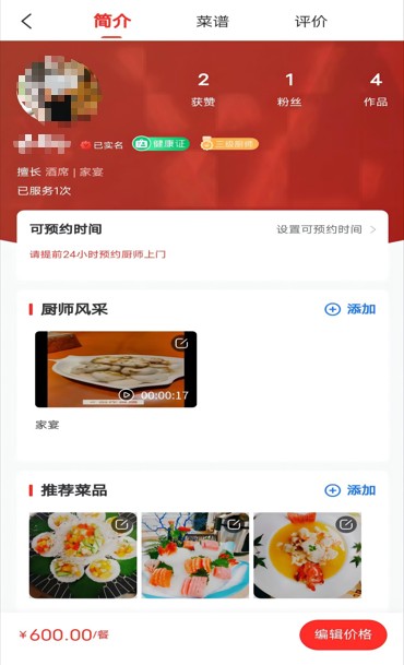 5.在个人主页可上传厨师风采与推荐菜品,设置可预约时间并自定义价格,打造专属展示页。