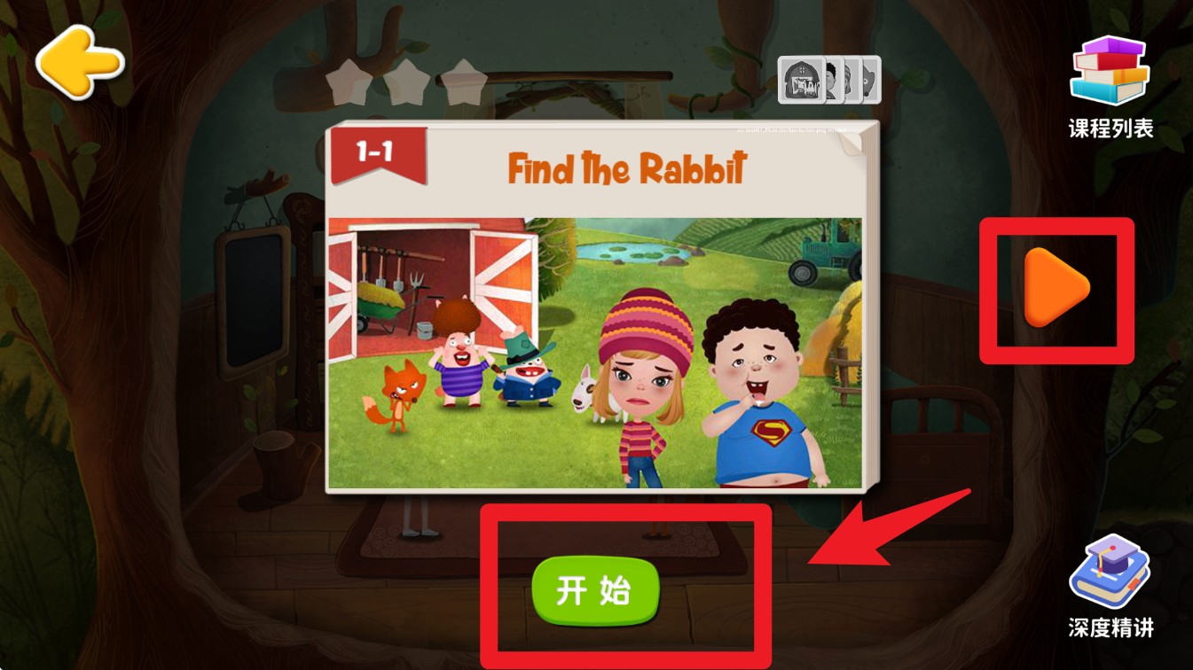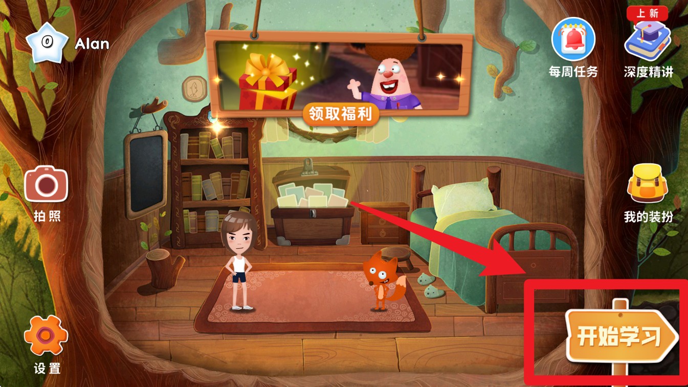 2. 进入树屋后点击右下角“开始学习”木牌,正式进入学习流程,会引导孩子从剧情中进行英语任务。