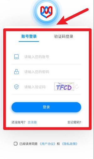 1、打开应用进入登录界面,可选择“账号登录”或“验证码登录”方式,输入信息并勾选协议后点击“登录”。
