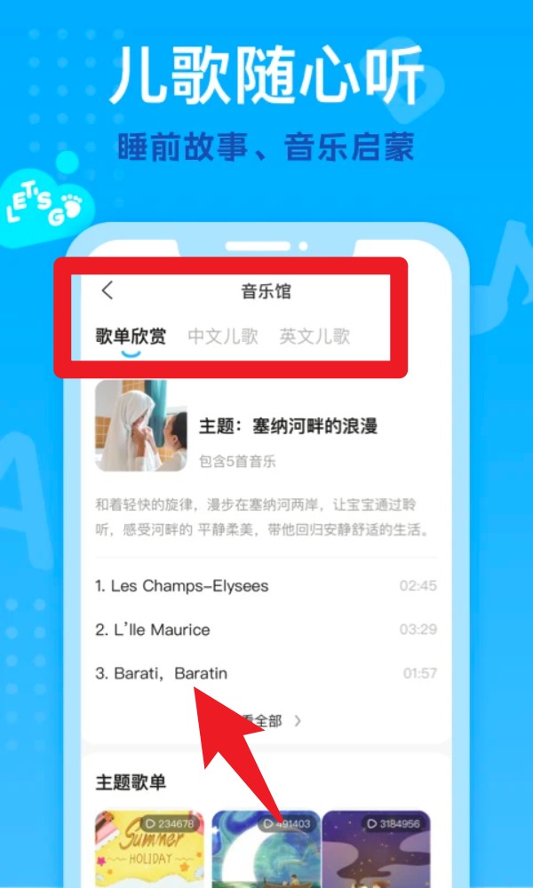 4. 点击“儿歌随心听”进入音乐馆,可选择中英文儿歌或主题歌单,边听边哄娃轻松陪伴。