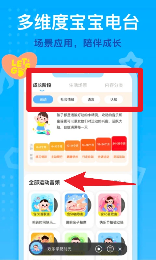 5. 打开“宝宝电台”功能,根据成长阶段选择合适内容,包含运动、认知、情绪等多维音频课程。