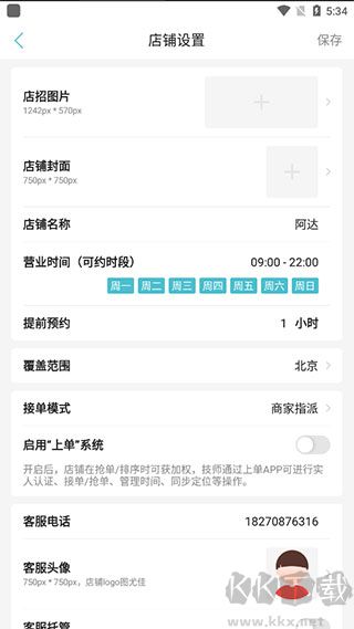 2、在店铺设置中,可自定义封面图片、设置服务覆盖范围及选择接单模式。