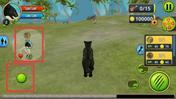 2、进入操控界面后,左下角摇杆控制豹子移动,上方小地图显示附近的动物。