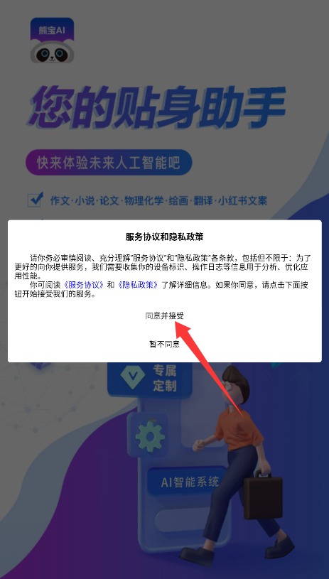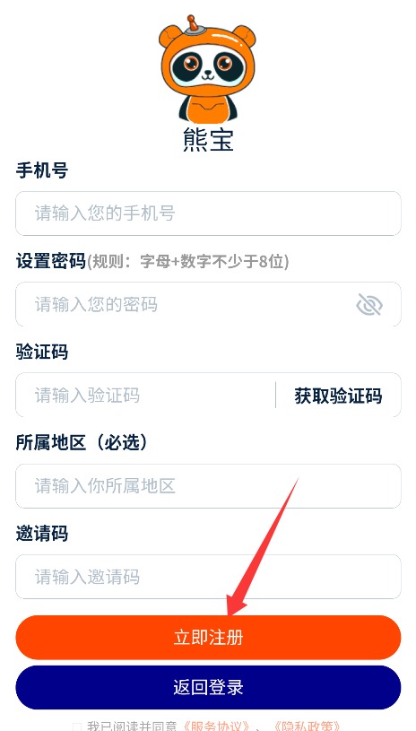 1、启动熊宝APP后,仔细阅读用户协议与隐私政策,点击同意并接受按钮进入注册页面。