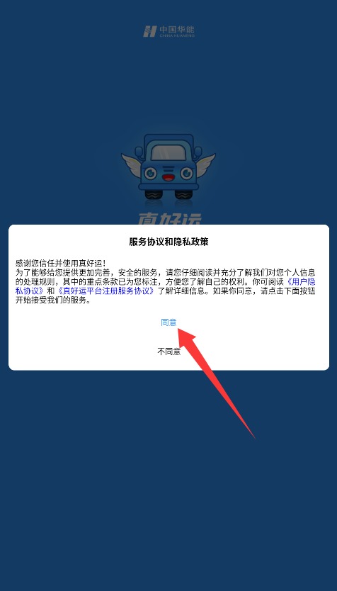 1、启动真好运司机APP后,系统会显示服务条款和隐私声明,阅读完毕点击同意进入操作界面。
