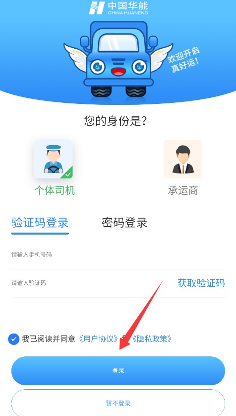 2、根据从业性质选择个体司机或承运商身份,通过手机号验证码完成快速登录验证。