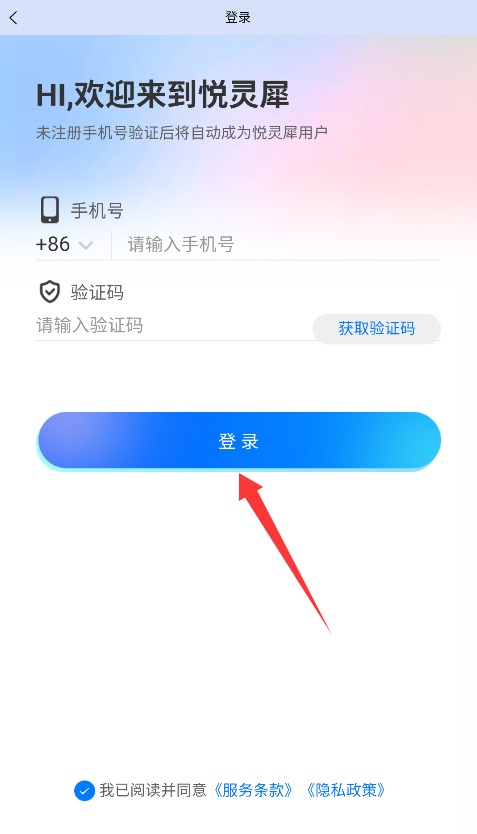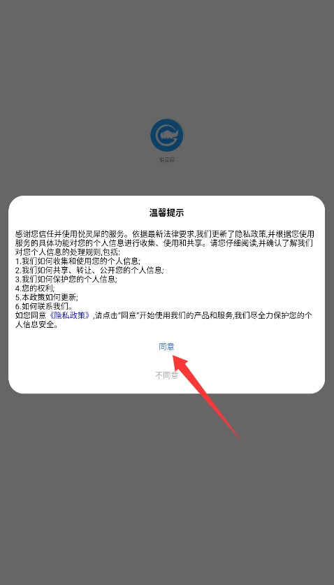 1、启动悦灵犀APP后,系统会显示服务条款和隐私声明,阅读完毕点击同意进入操作界面。
