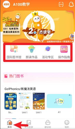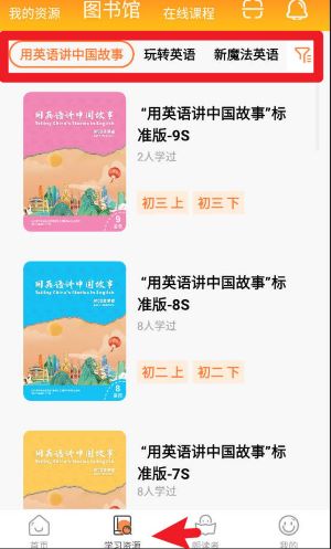 4、点击下方“学习资源”后进入图书馆,在“图书馆”页面顶部点击标签栏,可切换“用英语讲中国故事”、“玩转英语”等不同教材主题内容。