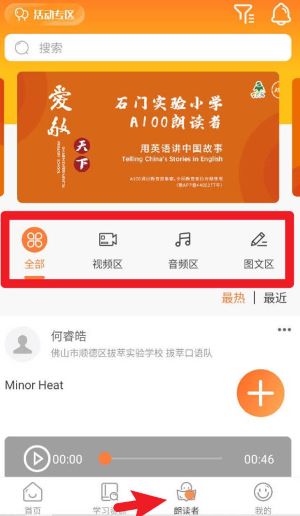 3、、在底部导航栏点击“朗读者”,进入后可通过分类筛选按钮查看全部、视频、音频或图文内容。