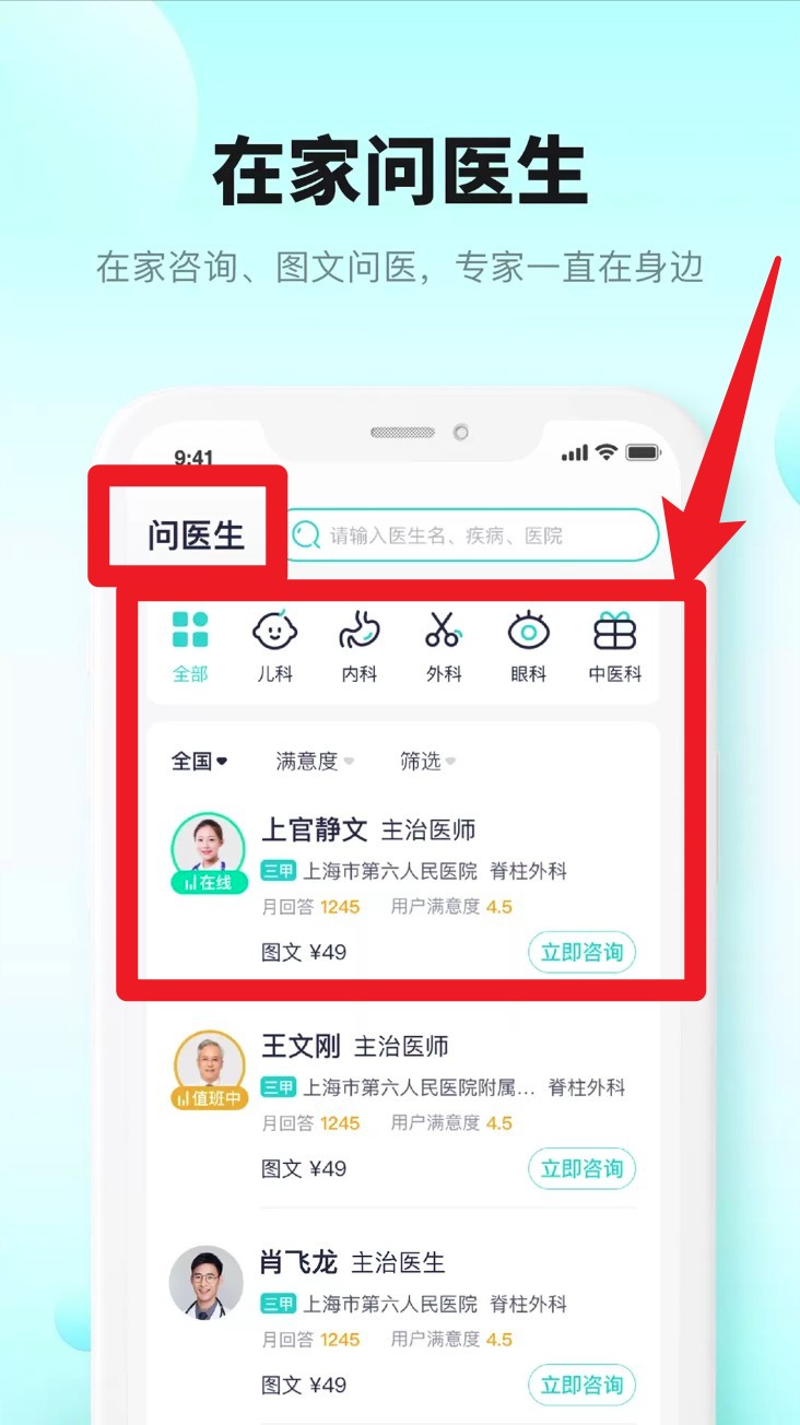 1. 在「问医生」页面中可浏览儿科、内科、外科等多个专科资讯,选择对应领域的医生了解健康建议或查看专业背景资料。