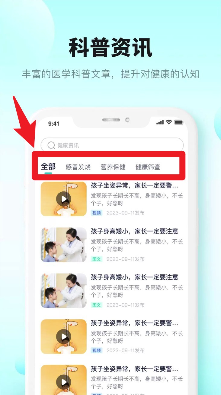 3. 「科普资讯」模块提供儿童身高发育、坐姿习惯等健康知识,家长可随时查阅科学认知,帮助孩子养成良好生活习惯。