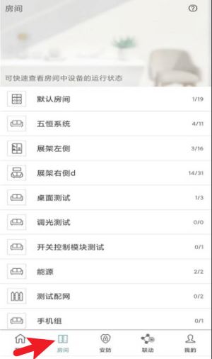 1、打开APP,点击“房间”选项,可快速切换并查看各个房间内设备的运行状态与数量。
