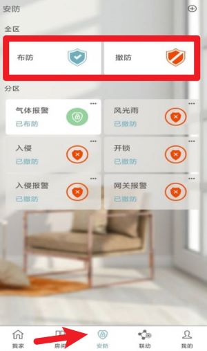 2、进入“安防”界面后,可一键选择布防或撤防,并分别设置各类传感器防区。