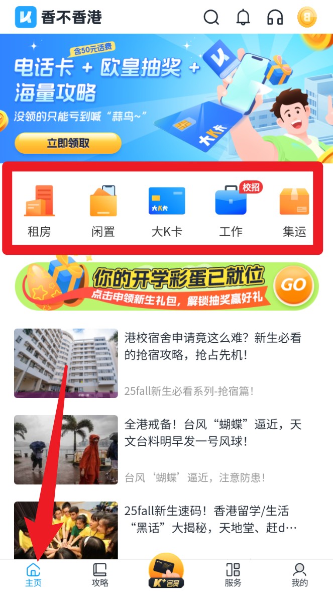 1. 进入首页后可直接浏览租房、工作、K卡、集运等热门功能模块,自由点选对应服务。