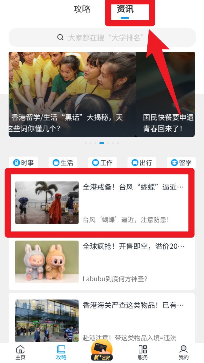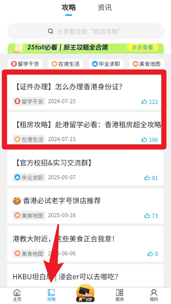 2. 切换至「攻略」页签,可查看港漂必备的证件办理、租房技巧、打工信息等分类攻略。
