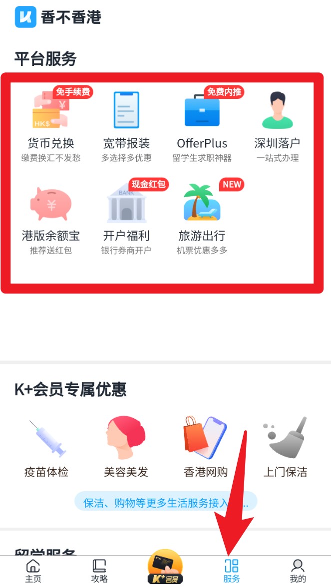 3. 点选底部「服务」标签,进入平台服务区,可办理货币兑换、宽带开户、旅游票务等项目。