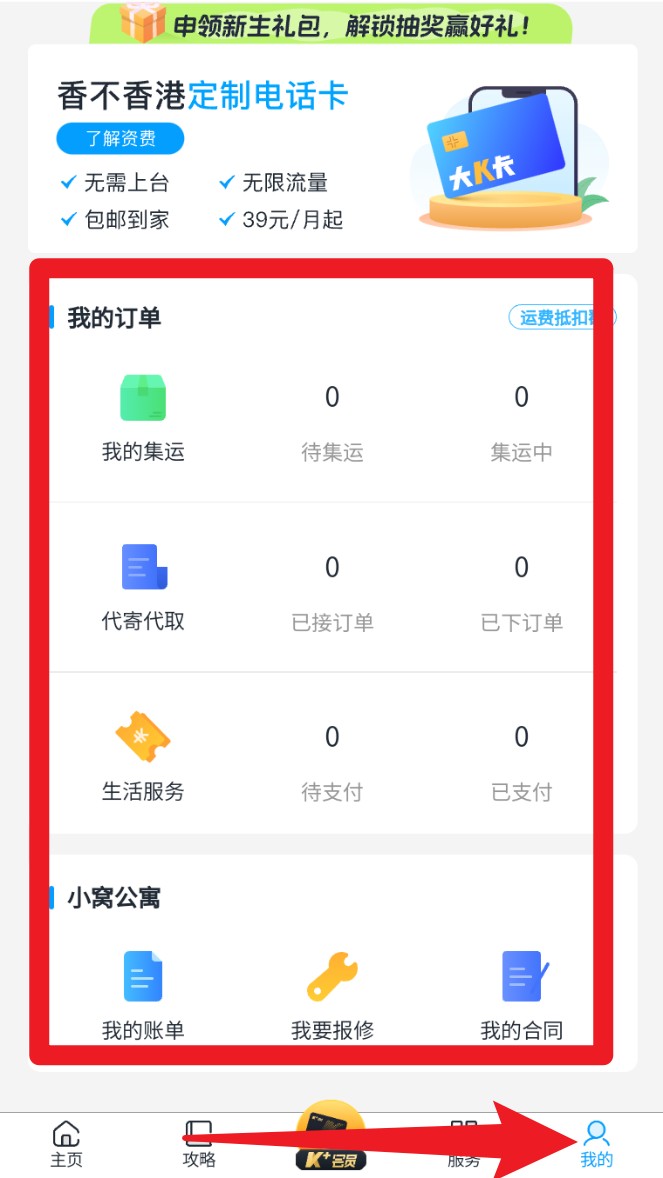 4. 在「我的」页面可查看个人订单,如集运进度、代寄状态或生活服务等消费记录。