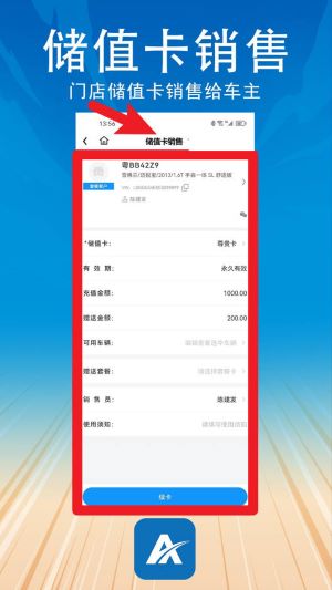 2、进入“储值卡销售”页面,选择车主与车辆后输入充值与赠送金额完成开卡或续卡。