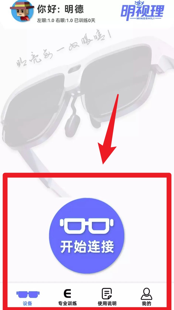 2. 登录完成后点击首页的“开始连接”按钮,App 将自动搜索并连接明视理智能眼镜设备。