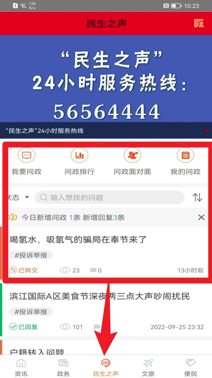 1. 在首页点击底部“民生之声”,可进入问政互动专区,提交问题或查看回复记录。