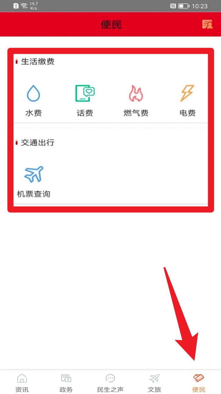 3. 点击“便民”页面可进行水电燃气缴费、话费充值及机票查询等生活服务操作。