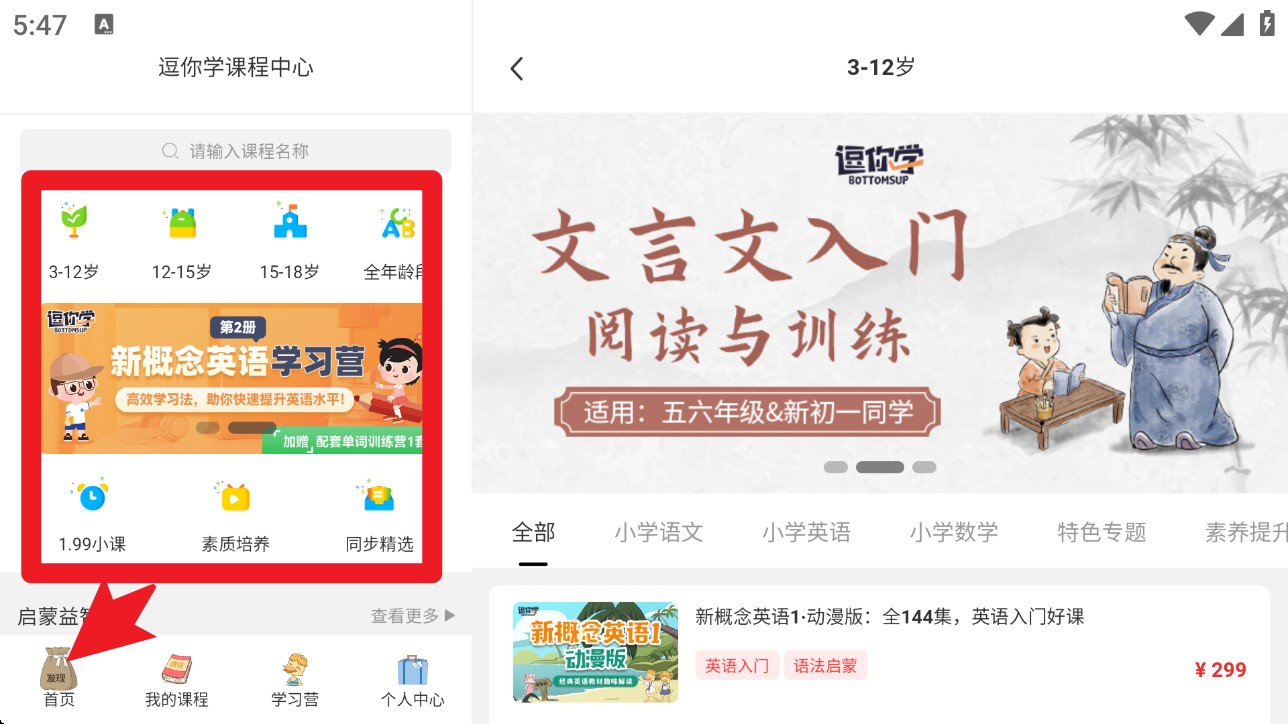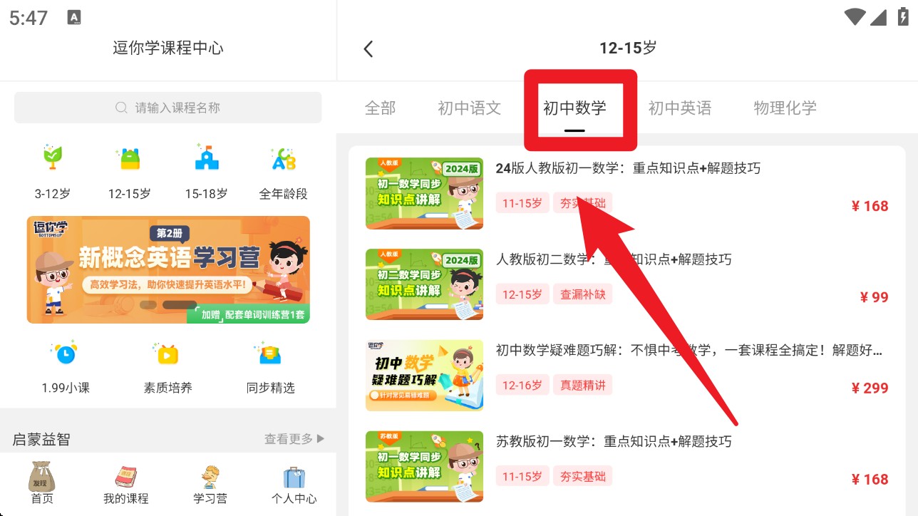 3. 切换至“12-15岁”专区后,可选择课程分类标签,如“初中数学”快速筛选目标内容。