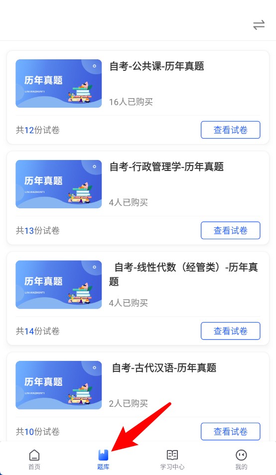 3、点击具体题库后可浏览详细试卷列表,选择试卷进入“试看”体验具体题目内容。