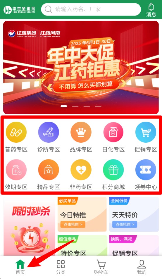 2、登录成功后进入首页,可浏览普药专区、诊所专区、品牌专区等多种药品分类模块。