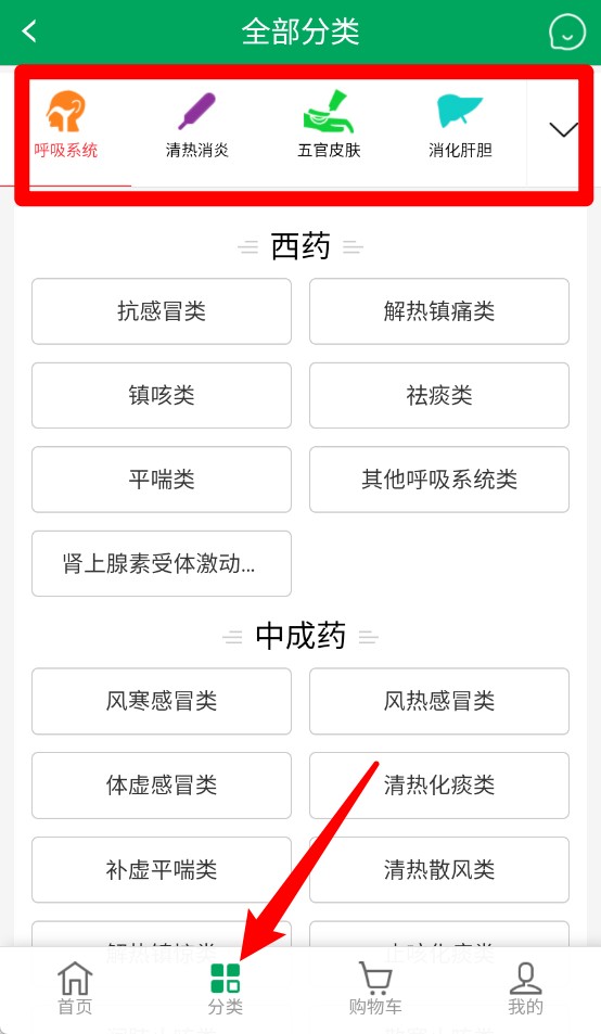 3、点击底部“分类”按钮,可选择呼吸系统、清热消炎、五官皮肤等具体药品分类进行查找。