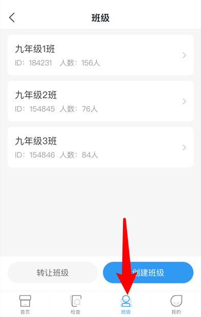 4、点击底部“班级”按钮查看所属年级和班级列表,并可创建或转让班级权限。