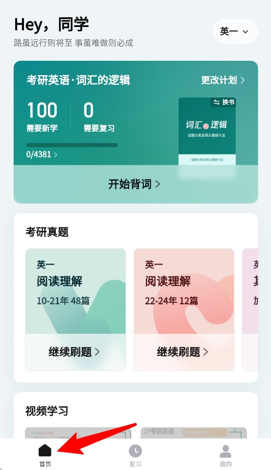 2、进入首页后可查看学习计划,支持背单词、刷真题、视频学习等多种考研英语内容模块。